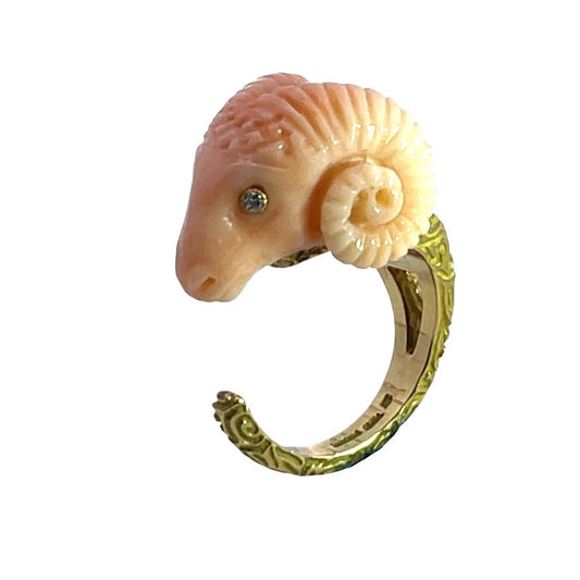 Modern 18KY gold, carved coral and diamond Ram's head ring