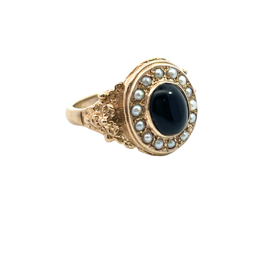 Art Noveau 9KY gold, onyx and seed pearl 'Mourning' ring