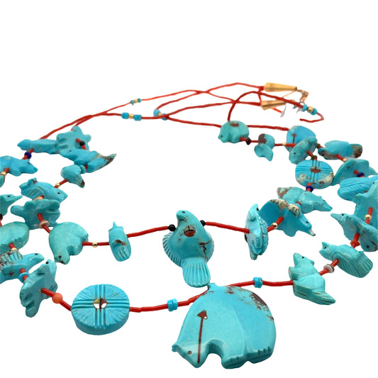 Native American 14KY gold, Turquoise, coral heishi and mother of pearl 'fetish' style necklace