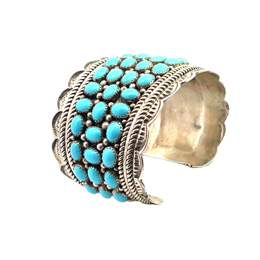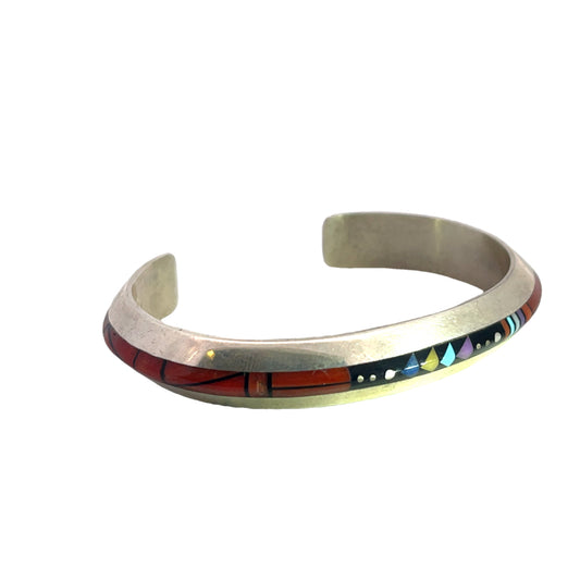 Native American Sterling silver coral, jet, sugilite and turquoise inlay knife edge cuff bracelet