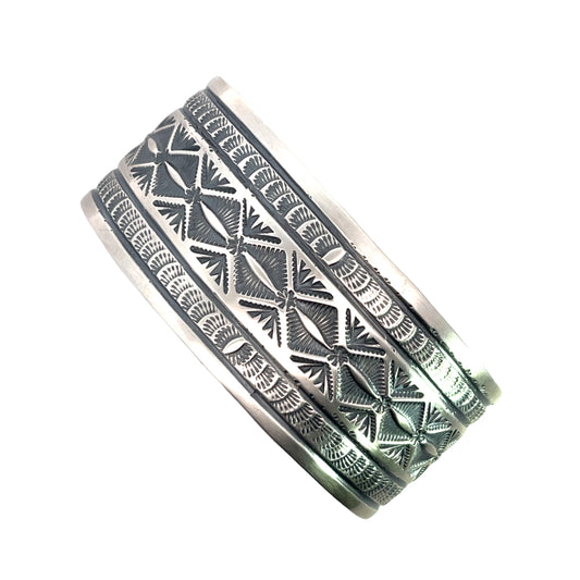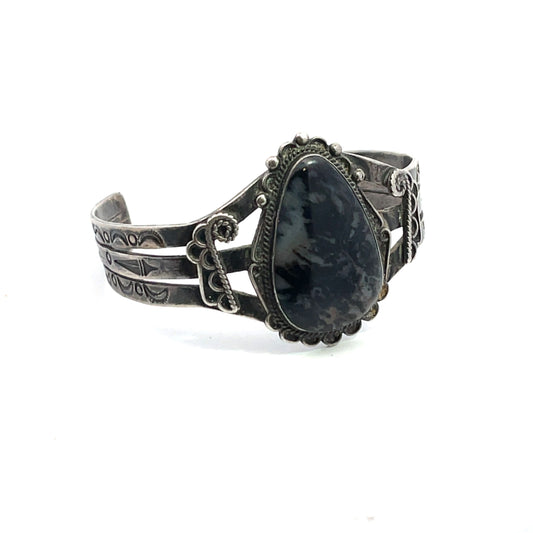 Native American: Fred Harvey Era Black Agate and Sterling Silver Cuff with Stamping c. 1930