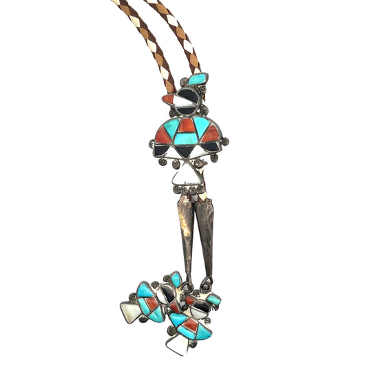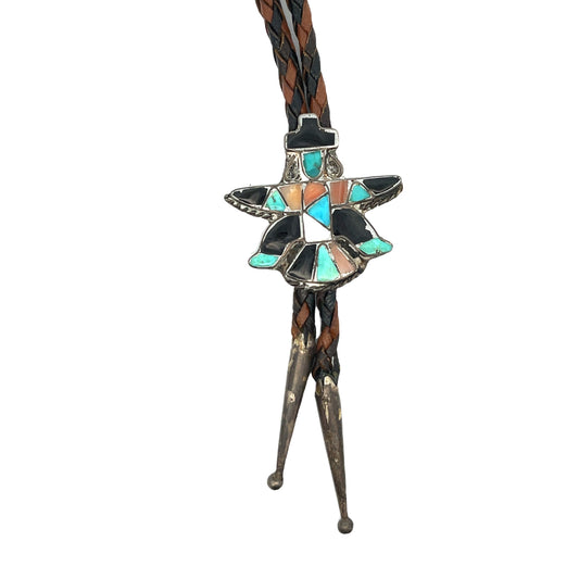 Native American Sterling Silver Bolo tie with Turquoise, Mother of pearl, Onyx, and Spiny Oyster