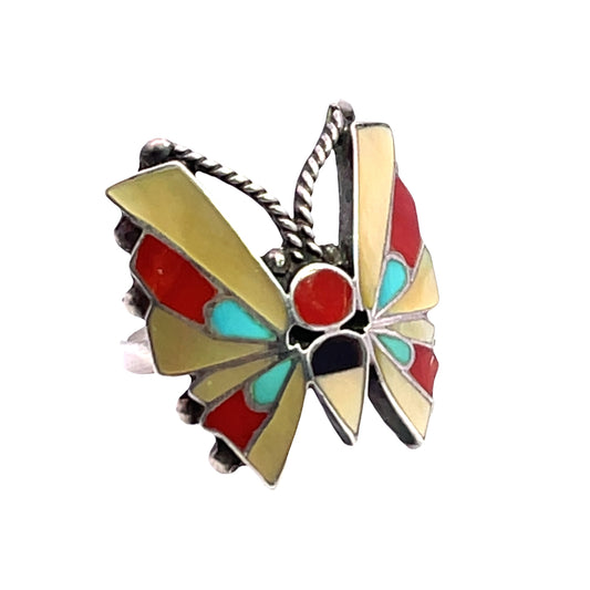 Native American Sterling Silver, mother of pearl, turquoise, onyx and coral butterfly ring