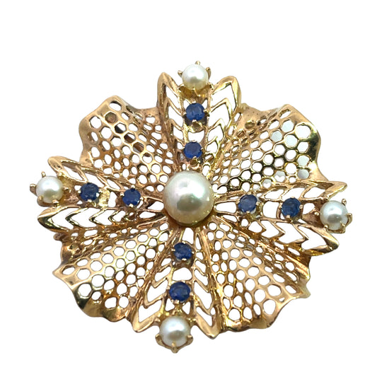 Mid-century modern 14KY gold, cultured pearl and blue sapphire brooch