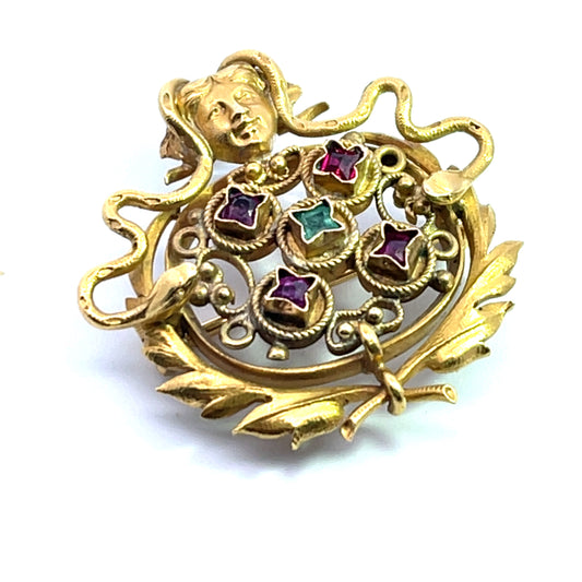 Victorian 18KY gold, synthetic emerald, ruby, and amethyst convertible brooch