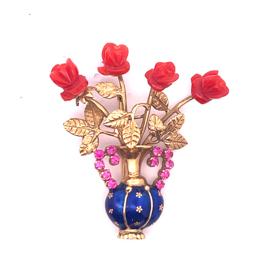 Victorian French 18K yellow gold, coral, ruby and enamel pin