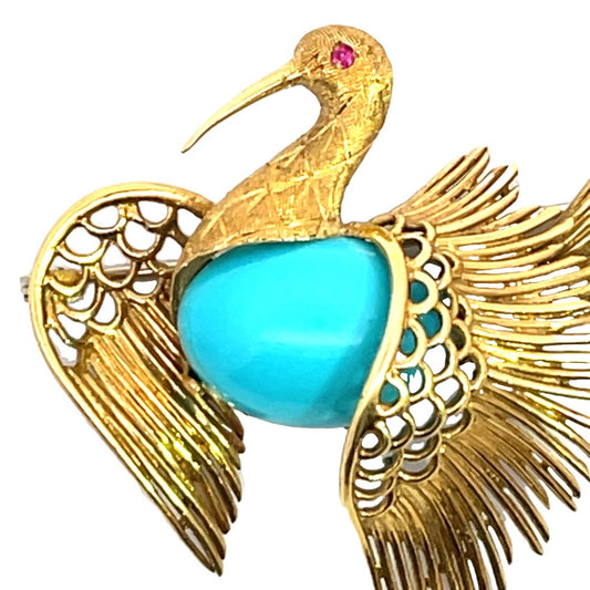 Mid Century Modern !8KY gold, ruby and turquoise brooch