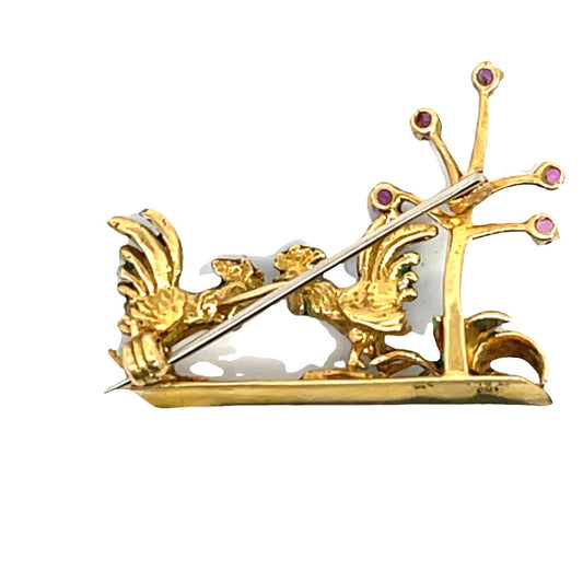 Victorian Italian 18KY gold Rooster pin with enamel and ruby accents