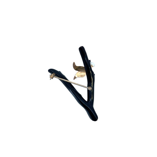 Mid Century Modern Black branch coral with 14KY gold leaves and 3 round cultured pearl accents