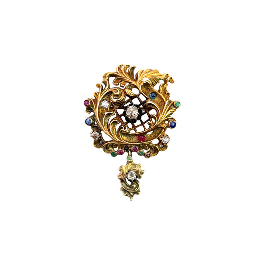 Victorian 14KY gold, diamond, ruby, sapphire and emerald brooch