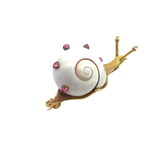 Modern 14KY gold with 18KY gold wash ruby, pearl and genuine snail shell brooch