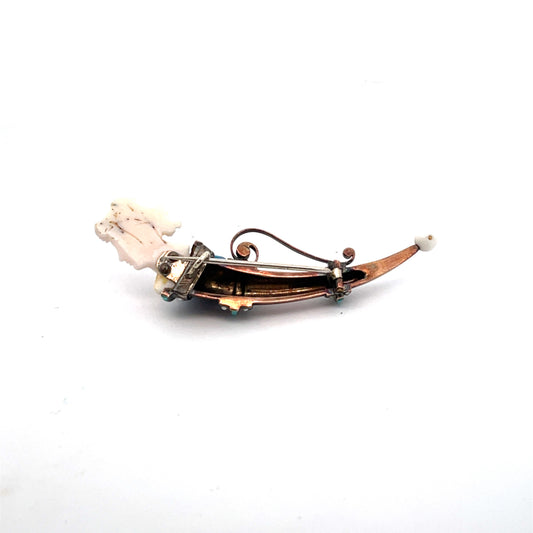 Early Victorian Etruscan Revival Pin in 14K rose gold, carved angel skin coral with accent seed pearls and Persian Turquoise
