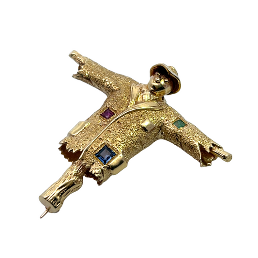 Mid-Century Modern 18KY gold, ruby, emerald and sapphire scarecrow brooch