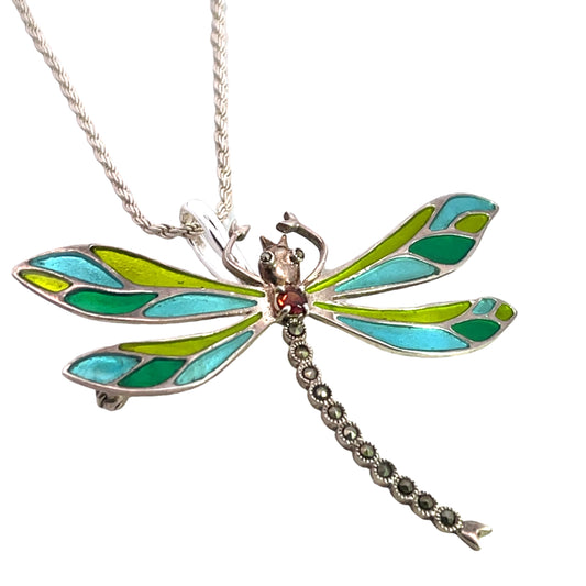 Victorian Sterling Silver, Garnet, marcasite and enamel dragonfly convertible pin/pendant