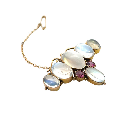Victorian 10KY gold moonstone and pink sapphire brooch