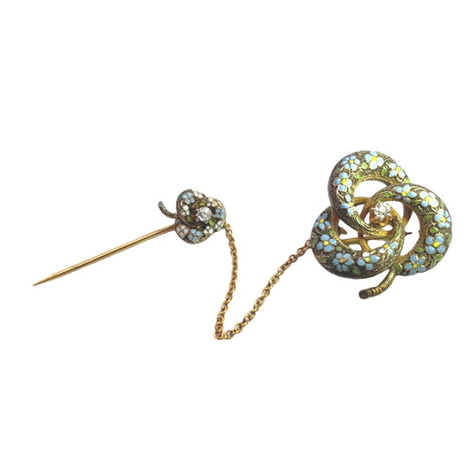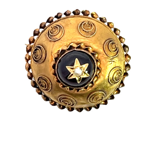 Victorian 14K Yellow gold enamel and diamond cloak pin with safety brooch