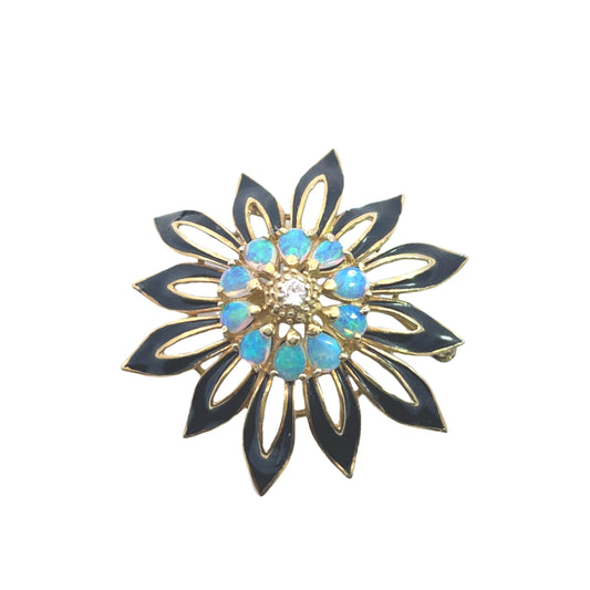 Modern 14KY gold, opal, diamond and black enamel brooch
