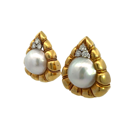 Mid Century Modern 18KY gold, Mabe Pearl, and diamond earrings