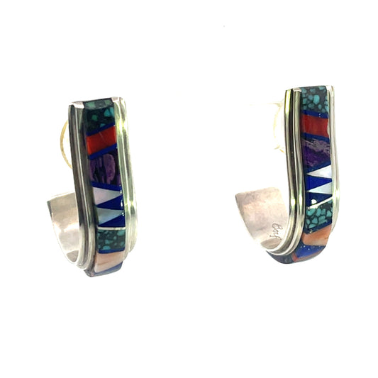 Native American Sterling silver, lapis, sugilite, coral, turquoise and mother of pearl inlay earrings