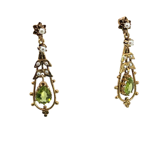 Victorian 14KY gold, peridot, and seed pearl earrings