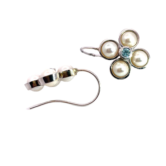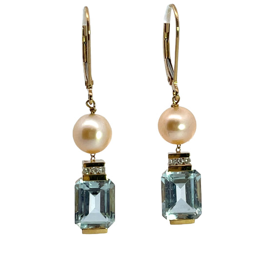 Modern 18KY gold aquamarine, diamond and pearl earring