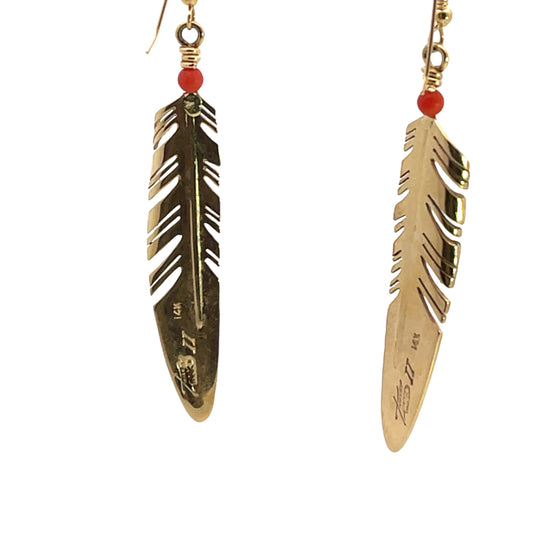 Native American 14KY gold, and coral feather Ray Tracey signed earrings
