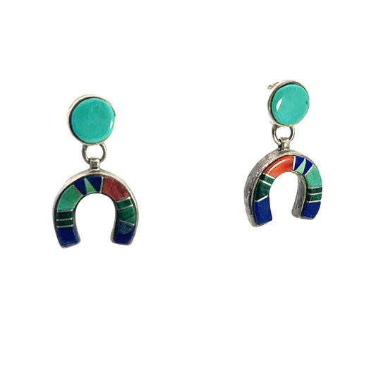 Native American Sterling silver, turquoise, malachite, lapis and coral horseshoe earrings