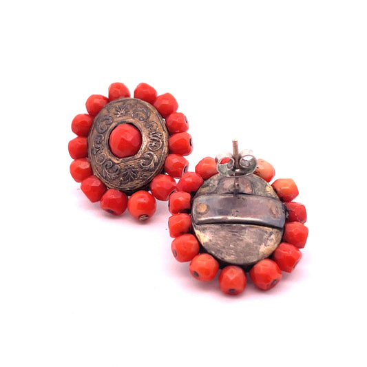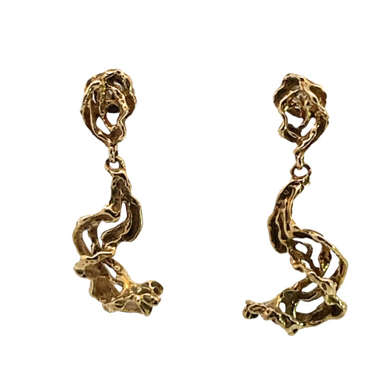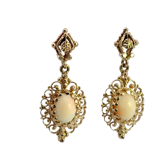 Victorian 14KY gold and angelskin coral filigree drop, post earrings