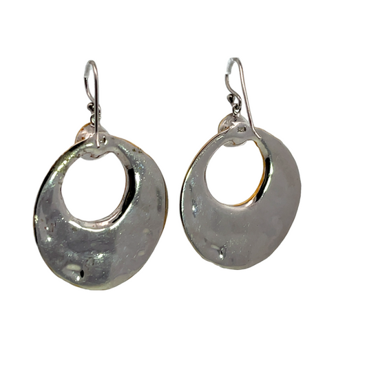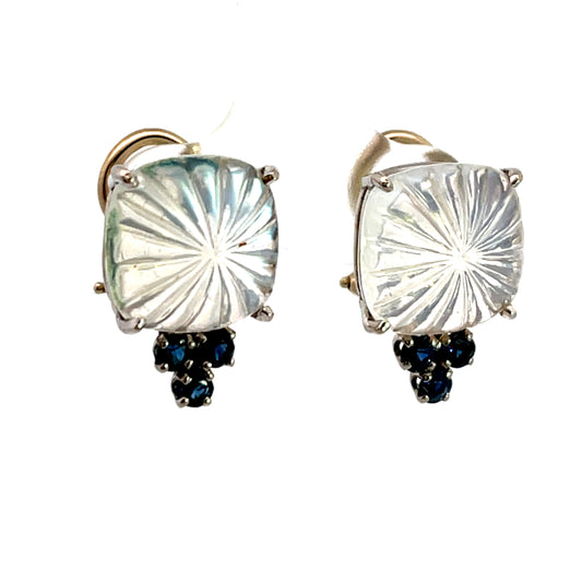 Modern Sterling Silver Mother of pearl and blue topaz hammered hoop post earrings