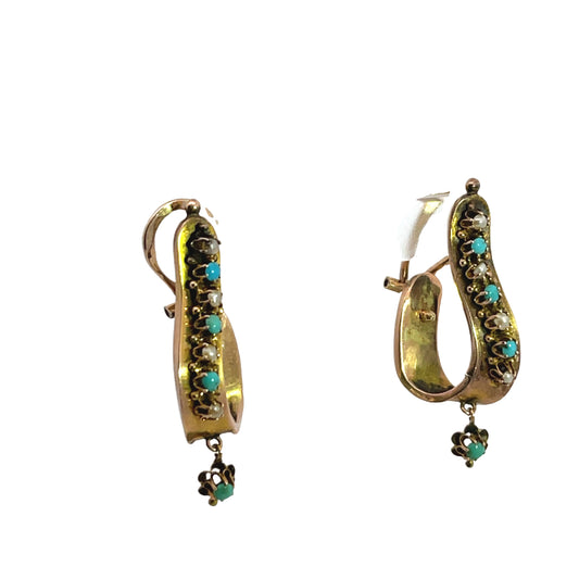 Early Victorian 14KY gold, turquoise and seed pearl earrings