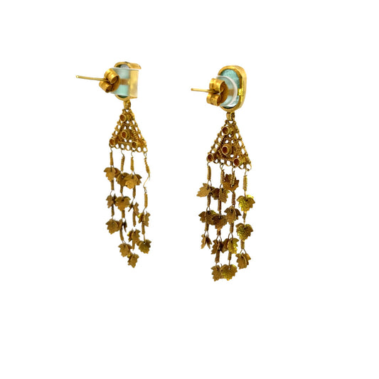Victorian 18KY gold hand fabricated beryl cabochon earrings with leaves.