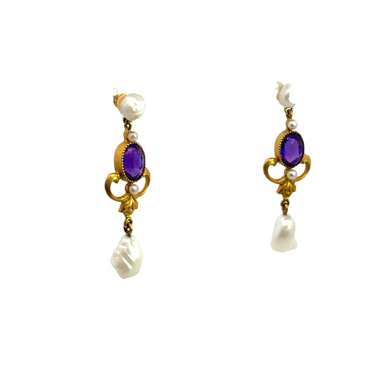 Art Noveau, American, 14KYellow, Amethyst and Natural Pearl Drop Earrings