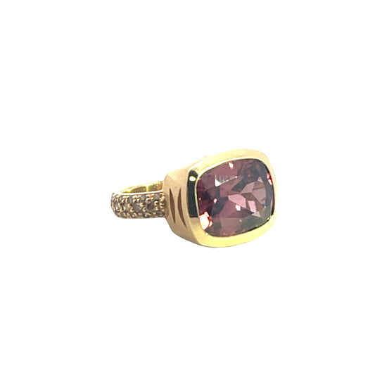 Modern custom 18KY gold, purple zircon, and champagne diamond pave ring