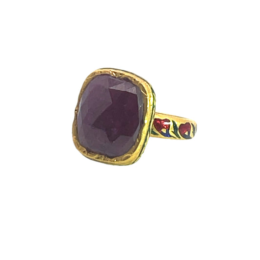 Victorian era 22KY gold, faceted rose cut ruby and enamel ring