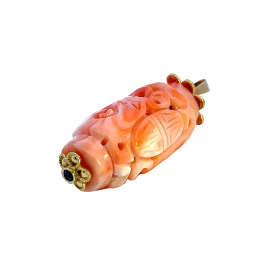 Contemporary: 18KY gold capped coral and accented pendant with sapphire detail