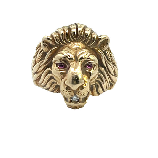 Victorian Lion Ring in 14 Karat Yellow gold, ruby eyes and diamond accent, Size 9.5