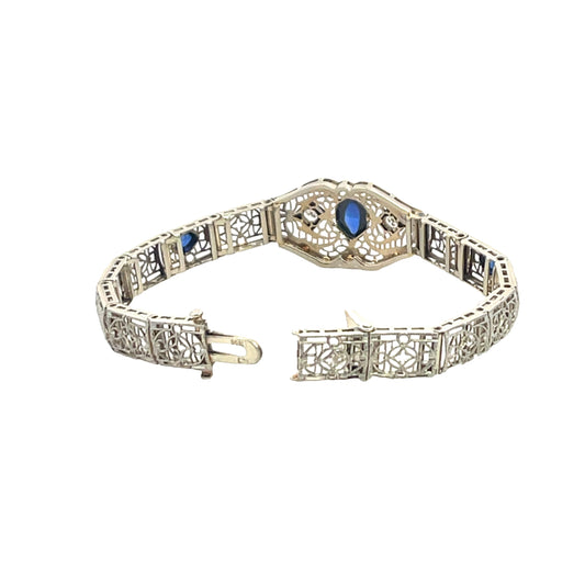 Art Deco 14K white gold, lab grown sapphire cabochons and diamond articulated link bracelet