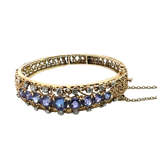 Modern 14KY gold, Tanzanite, Diamond filigree hinged bangle cuff bracelet