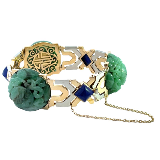 Art Deco 18K white and yellow gold with carved jadeite and lapis gemstone link bracelet
