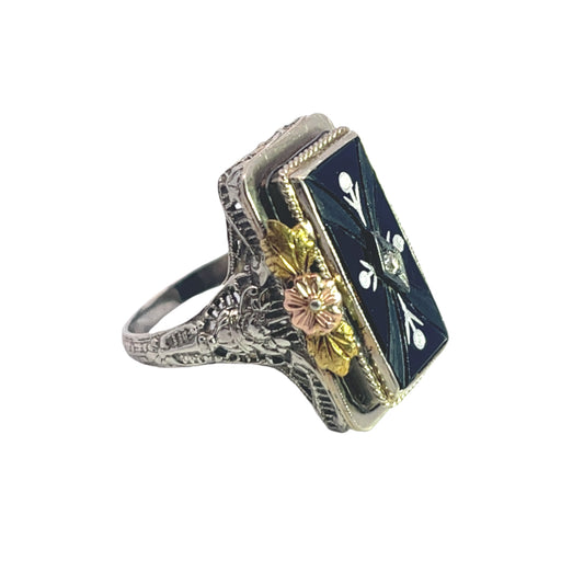 Art Deco 14KY, white and rose gold, platinum, diamond and onyx filigree ring