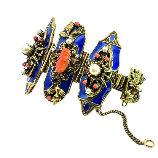 Victorian Gold fill, natural coral, imitation pearl and enamel link bracelet