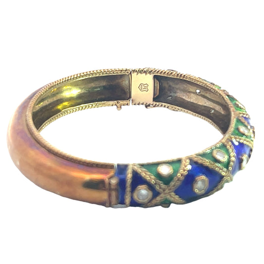Modern 14KY gold, diamond and enamel hinged bangle bracelet