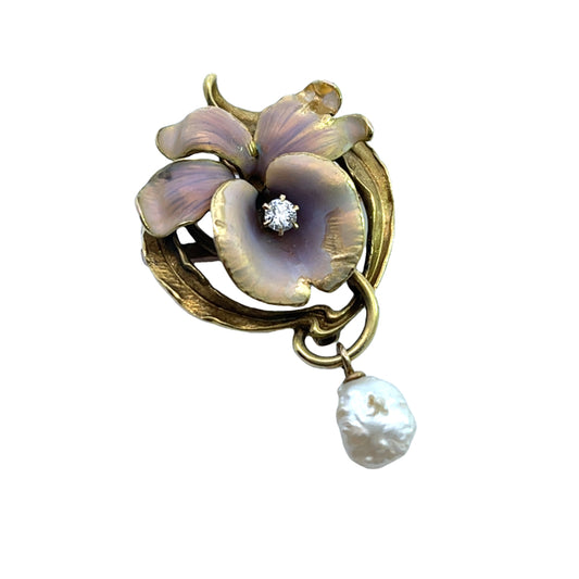 Art Noveau 14KY gold, diamond, pearl and enamel convertible pin/pendant