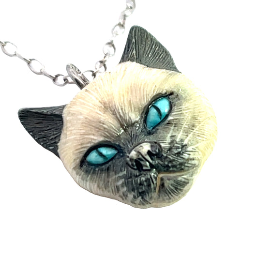 Victorian Sterling silver and carved bone Siamese cat pendant