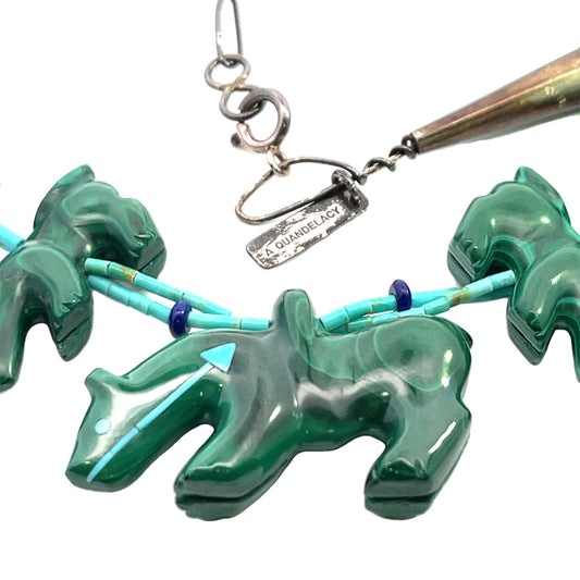 Native American Sterling silver, turquoise and malachite carved fetish necklace