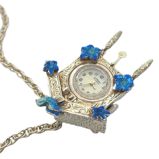 Modern 14KY gold and enamel cuckoo clock pendant and chain