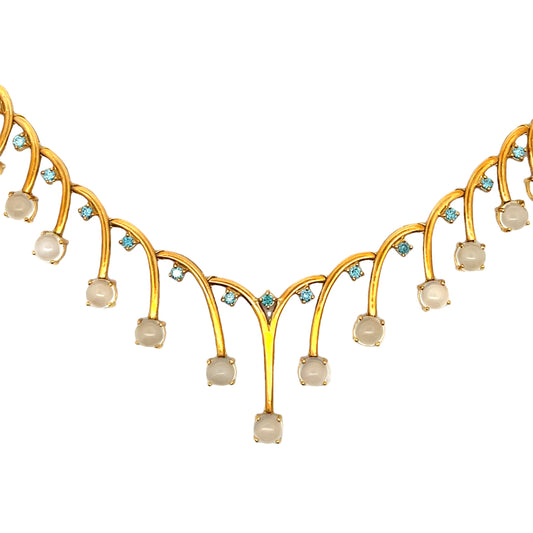 Modern 18KY gold, moonstone and irradiated blue diamond necklace