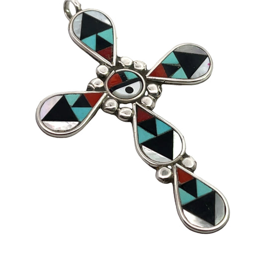 Native American Sterling silver, onyx, mother of pearl, turquoise and coral cross pendant