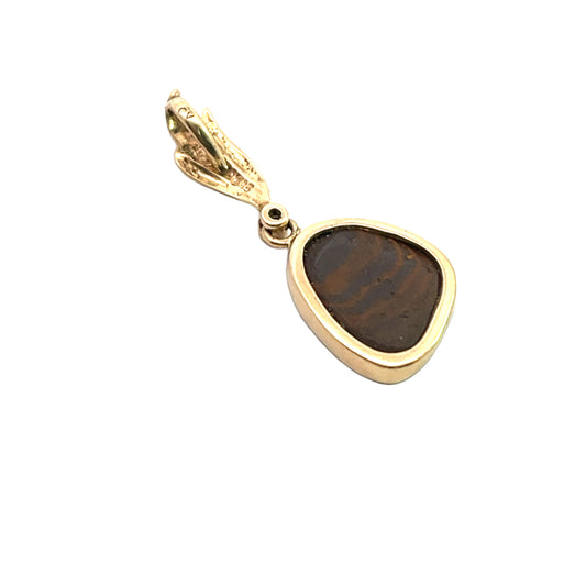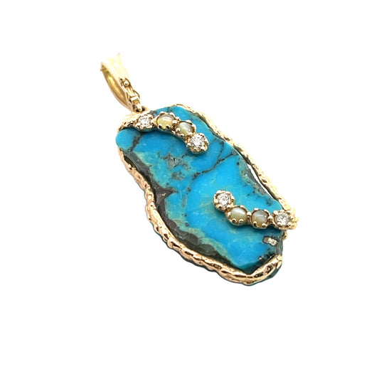 Modern 14KY gold turquoise, pink tourmaline, cat's eye chrysoberyl and diamond pendant