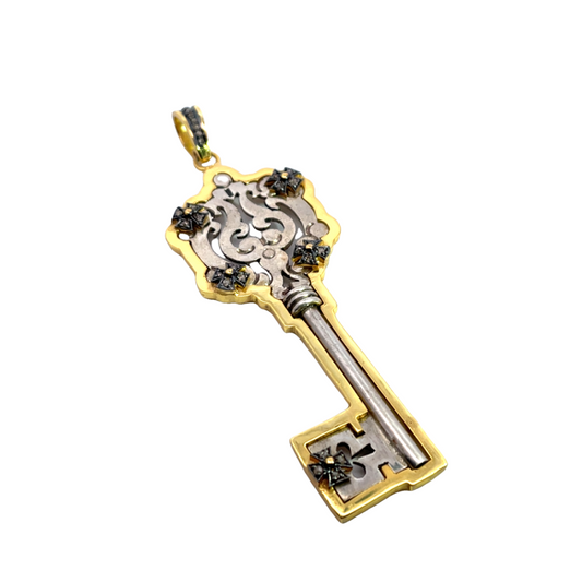 Modernized Sterling Silver, gold vermeil, and diamond skeleton key pendant